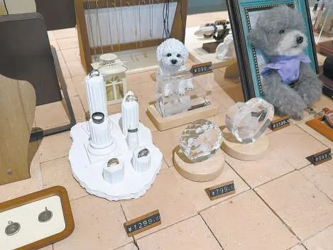 店内一整面墙上,摆满了陶瓷、金属、玉石等不同材质的骨灰罐,最贵的一款近2000元。此外,宠物纪念品也是五花八门。例如,骨灰可以制成琉璃吊坠,还可以制成售价3000元左右的骨灰晶石,而宠物肖像,既可以做成千元左右的水晶碑,也可以制成宠物模型。其中,一款油塑宠物模型标价8800元。