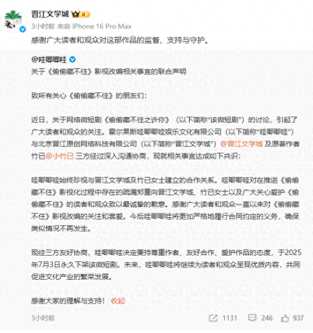 哇唧唧哇方面表示,经过与晋江文学城、原作者竹已三方沟通,最终达成了共识,哇唧唧哇承认在推进《偷偷藏不住》影视化过程中存在的疏漏,“今后哇唧唧哇将更加严格地履行合同约定的义务,确保类似情况不再发生。现经三方友好协商,哇唧唧哇决定秉持尊重作者、友好合作、爱护作品的态度,于2025年7月3日永久下架该微短剧。”