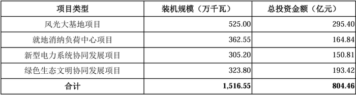 本此拟募资用途:本次拟募集资金804.46亿,其中295.40亿用风光大基地项目,164.84亿用就地消纳负荷中心项目,150.81亿用新型电力系统协同发展项目、193.42亿用于绿色生态文明协同发展项目。具体项目如下: