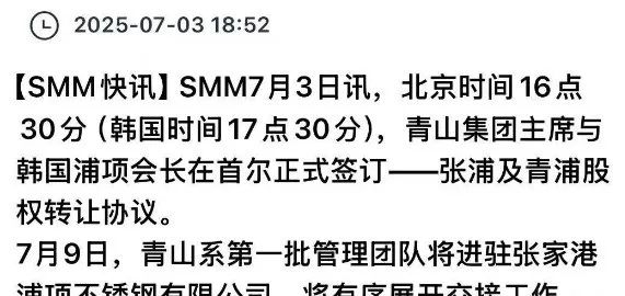 7月9日,青山系第一批管理团队将进驻张家港浦项不锈钢有限公司,将有序展开交接工作。