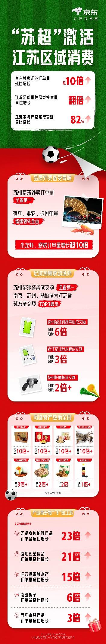 “苏超”赛事激活了江苏省乃至全国的足球相关消费。京东数据显示,开赛以来江苏球衣、球鞋、球袜、球门等足球相关品类搜索量同比增长翻倍,其中苏州相关商品总成交额位居全省第一,南京球衣成交额则一枝独秀,徐州足球训练背心成交同比增长6倍。