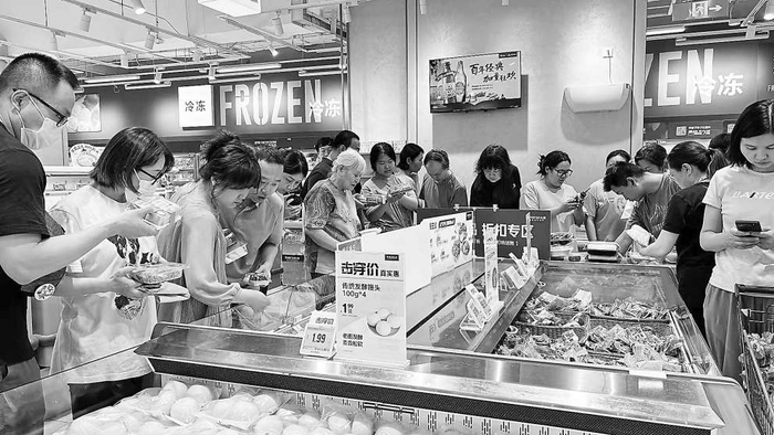 “这个还能打折吗?”“几点能打7折啊?”……物美超市柜台前,店员一边卖力吆喝推销,顾客一边凑着脸上去热切询问。“就像是在逛菜市场一般,大家一起围在柜台前,特别热闹,还能讲价,有时候看到还没来得及贴上打折标签的产品,大胆地跟店员问一句‘打折吗’,相同的产品就能以低价买到。”小韩常在下班后,去物美超市“捡漏儿”一番。她不仅看中划算的价格,还迷恋这一来一往中的人情味和烟火气。