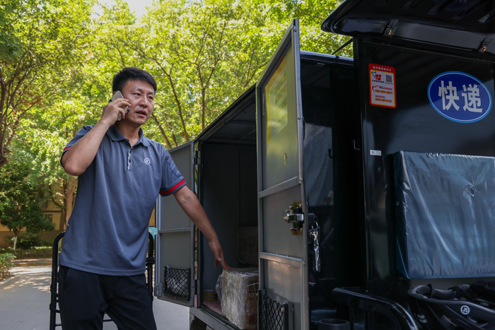 6月29日,快递员在西安建筑科技大学给顾客木先生打电话,准备派送来自广州的快件。新华社记者 毛思倩 摄