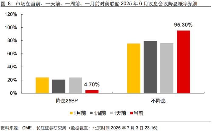 3. 往前看,短期内,美国就业的韧性表现让美联储仍有充足空间等待,7月继续维持“按兵不动”概率较高;中期,“对等关税”暂停期满在即,实质的关税落地规模,及其对经济的影响仍是决定后续货币政策的关键。