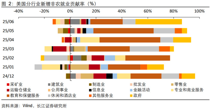 3)此外,本月政府部门新增就业表现亮眼,较5月增加6.6万人,但这主要是得益于州政府教育相关岗位就业的强劲增长,联邦政府部门仍受政府效率部门(DOGE)裁员影响,减少了0.7万个岗位。