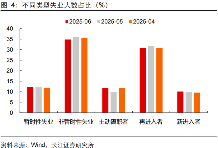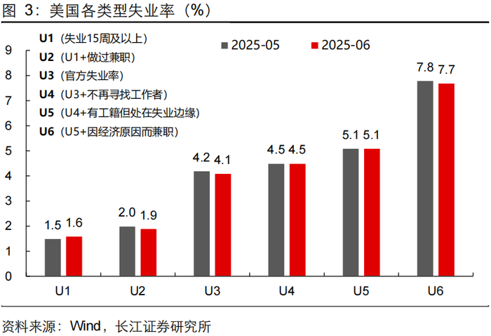 各类型失业率来看,U1上升,U4-U5持平,U2-U3、U6下降,指向短期失业情况改善的同时长期失业问题也有所加剧。