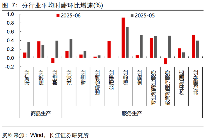 1)商品生产行业薪资环比增速回落至0.1%,其中采矿业、制造业时薪环比增速均回落,建筑业时薪环比增速小幅回升;