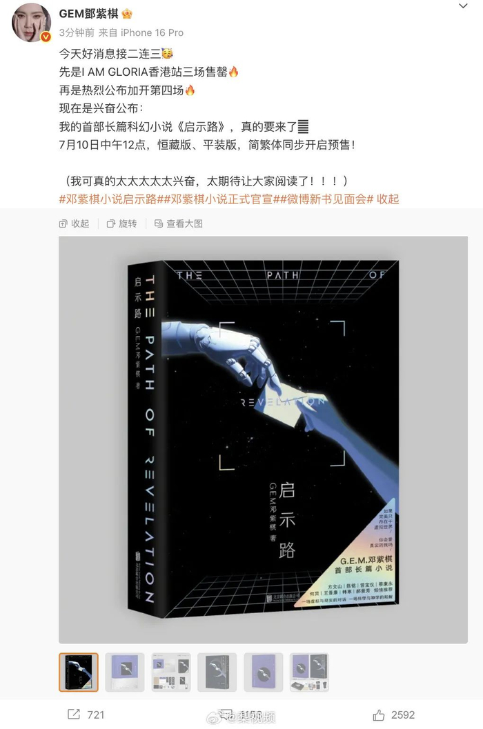 7月4日,@GEM鄧紫棋 官宣首部长篇科幻小说《启示路》将开启预售。这也太全能了吧!