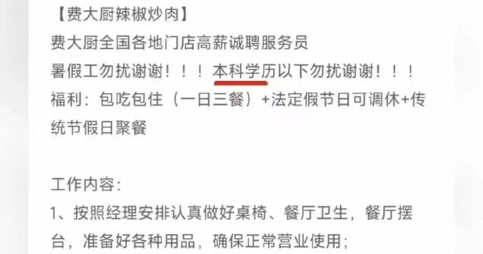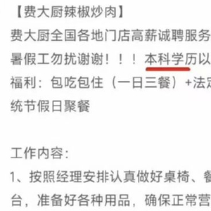 招聘服务员要求“本科以下勿扰”,费大厨涉事门店回应