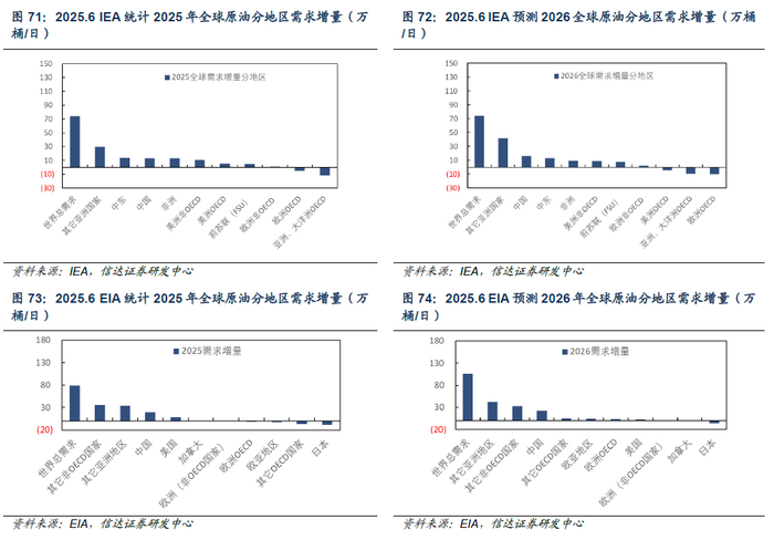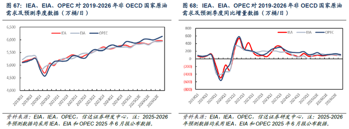 IEA、EIA和OPEC预计亚洲地区的非OECD国家为2025-2026年全球原油需求增量贡献主力。EIA、IEA和OPEC三机构在2025年6月预计2025-2026年亚洲及非洲和拉美地区非OECD国家原油需求将继续带动全球原油需求保持增长,OECD国家需求保持稳定。