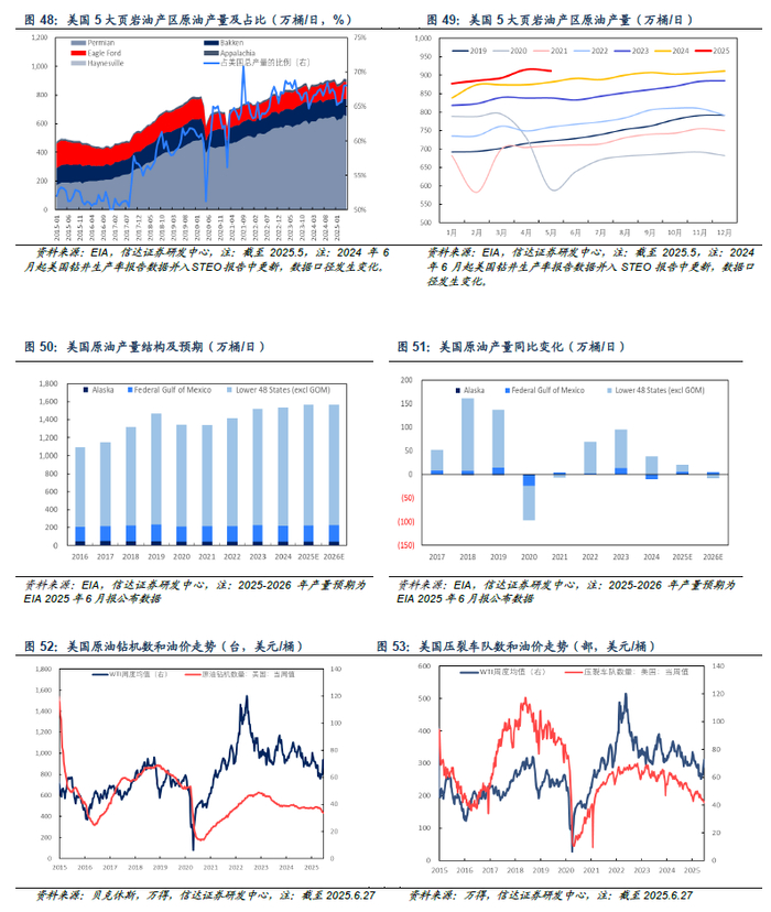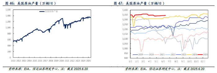 EIA在2025年6月报中,预计2025-2026年全年美国原油产量平均分别为1341.40、1337.19万桶/日,同比+20.60、-4.21万桶/日。