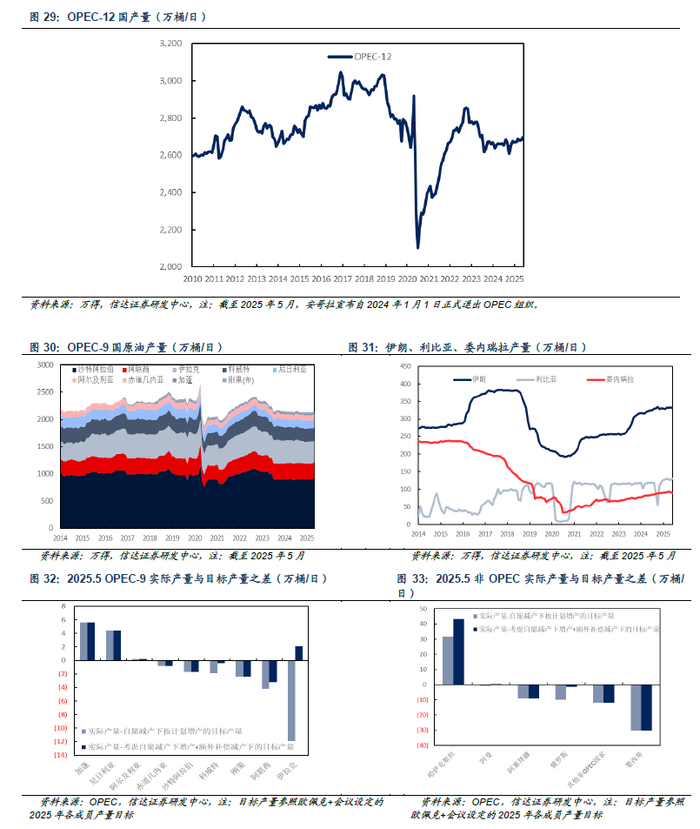 对于未参与减产的伊朗、利比亚和委内瑞拉,三个国家在2025年5月的原油产量分别为330.3、130.2、89.6万桶/日,环比-2.5、+3.7、-3.2万桶/日。