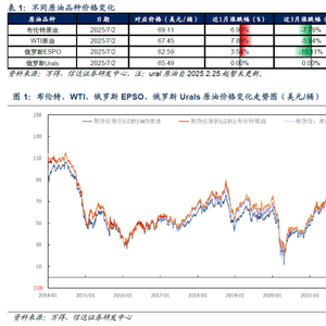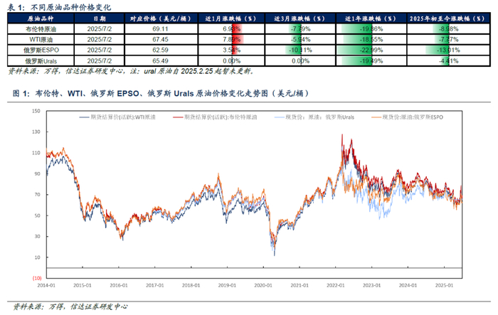 截至2025年7月2日,布伦特原油、WTI原油、俄罗斯EPSO原油、俄罗斯Urals原油价格分别为69.11、67.45、62.59、65.49美元/桶,近一个月主要油品涨跌幅分别为:布伦特原油(+6.93%)、WTI原油(+7.89%)、俄罗斯ESPO(+3.54%)、俄罗斯Urals(+0.00%)。2025年年初至2025年7月2日期间不同油品涨跌幅分别为:布伦特原油(-8.98%)、WTI原油(-7.77%)、俄罗斯ESPO(-13.01%)、俄罗斯Urals(-4.41%)。