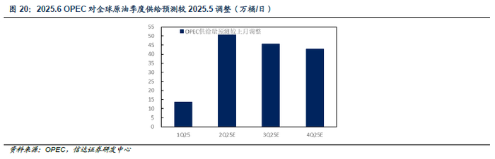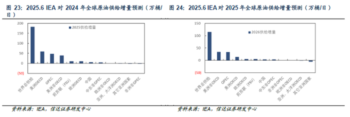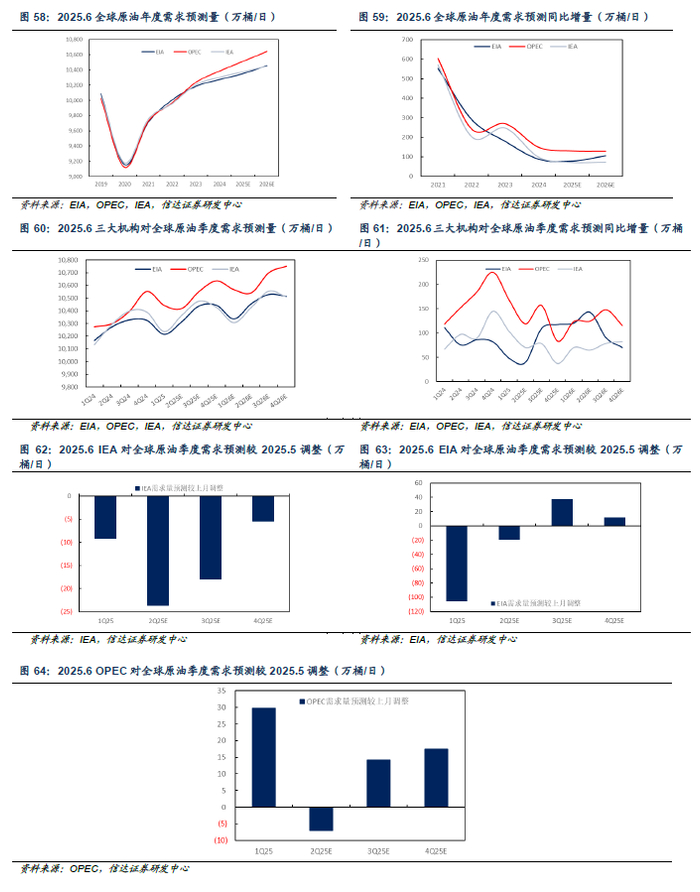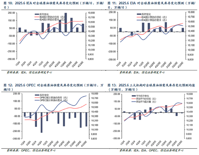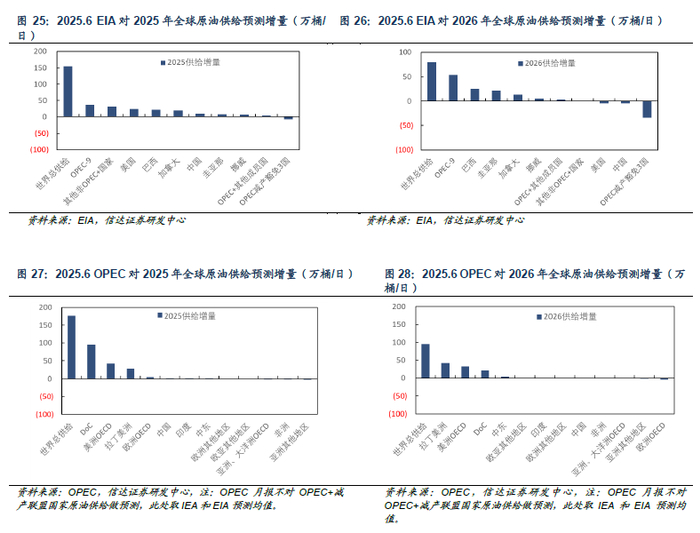具体来看,2025年6月IEA、EIA、OPEC预测2025Q2全球原油供给同比增量分别+147.64、+146.64、+186.59万桶/日,相较2025年5月预测变化分别+24.23、+45.55、+50.64万桶/日。