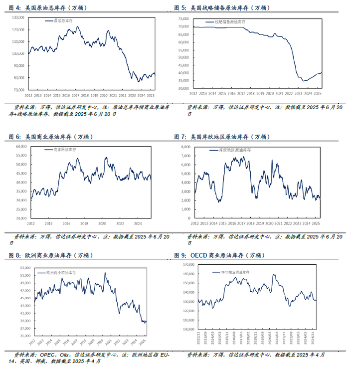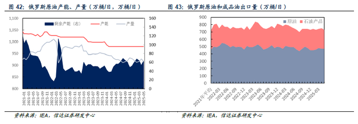 产量方面:2025年5月,俄罗斯原油产量为917万桶/日,环比-10万桶/日,原油剩余产能为63万桶/日,环比+10万桶/日。