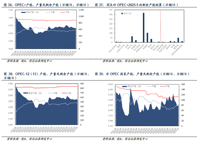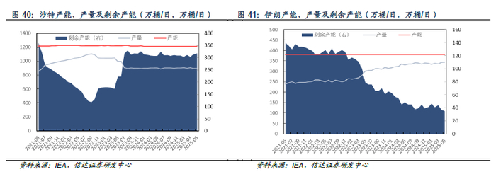 根据IEA 2025年6月报披露数据,2025年5月OPEC+合计剩余产能为631万桶/日,环比-13万桶/日。其中,OPEC-12国剩余产能为551万桶/日,主要集中在沙特、阿联酋,两国剩余产能分别为317、103万桶/日;非OPEC国家剩余产能为80万桶/日,主要集中在俄罗斯,其剩余产能为49万桶/日。
