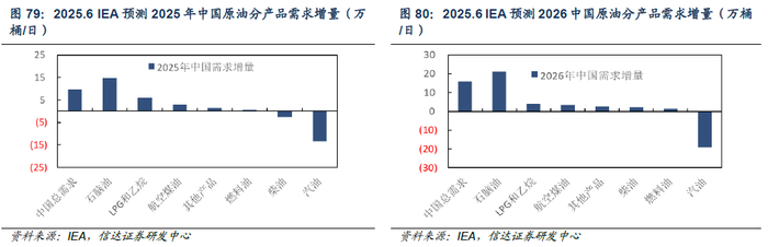 中国方面,IEA预计2025年中国原油需求增量同比改善,主要依赖石脑油等化工用油拉动。IEA在2025年6月报中预计2025年中国柴油、汽油、航空煤油需求也将较2024年分别-2.5、-13.4、+2.9万桶/日至352.7、349.7、95.4万桶/日;化工品板块,预计2025年LPG和乙烷、石脑油需求分别将较2024年+6.0、+14.7万桶/日至270.8、246.6万桶/日。