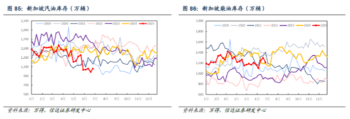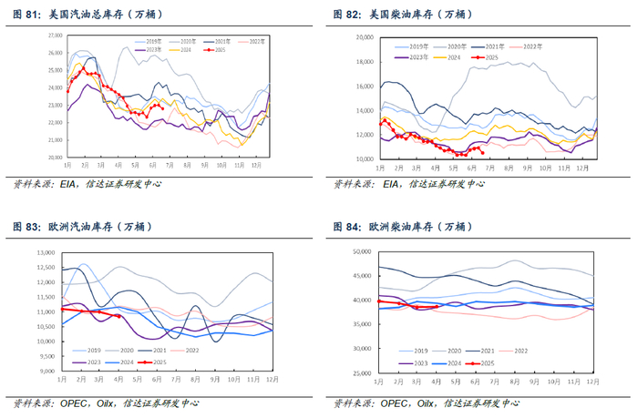美国汽油开始去库,欧洲汽油库存处于近5年低位水平。截至2025年6月20日当周,美国汽油、柴油库存分别为22793.80、10533.20万桶;截至2025年4月,欧洲汽油、柴油库存分别为10840、38650万桶;截至2025年6月25日,新加坡汽油、柴油库存分别为1062、1212.9万桶。