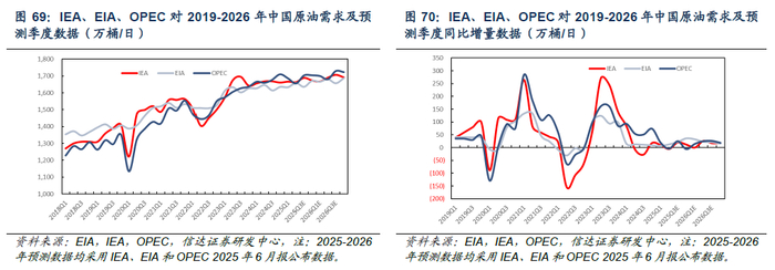 IEA、EIA和OPEC预计2025年中国需求增量放缓。IEA、EIA和OPEC 2025年6月报预期,2025年中国原油需求分别为1673.1、1650.3、1687.3万桶/日,较2024年分别增加9.7、19.3、21.8万桶/日,分别占非OECD国家总需求增量的11.90%、22.44%、19.35%。IEA、EIA和OPEC预计2026年中国原油需求分别为1688.9、1673.2、1708.5万桶/日,较2025年分别增加15.8、22.9、21.2万桶/日,分别占非OECD国家总需求增量的16.03%、22.47%、17.63%。