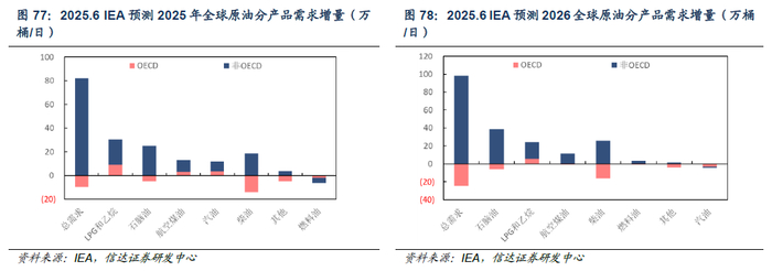 IEA预计2025-2026年化工用油需求恢复更为明显,同时上调了2025年全球汽油需求增量,且非OECD国家和OECD国家柴油变化趋势逐渐分化。根据IEA 2025年6月报, 2025年全球航空煤油、汽油、柴油需求较2024年分别+13、+11.8、+4.4万桶/日至769.9、2736.2、2834.2万桶/日,其中柴油主要受OECD国家需求快速下降影响,汽油需求则受油价下跌影响有所回暖;化工品板块,2025年全球LPG和乙烷、石脑油需求将分别较2024年+30.2、+20.3万桶/日至1539.4、746.2万桶/日。