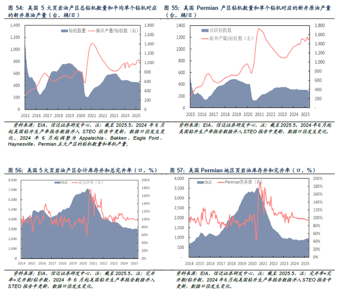 2025年5月,美国5大页岩油产区库存井(DUC)数量为3028口,环比+16口,总完井率为97.66%,环比-0.7pct。其中,Permian地区库存井数量为982口,环比+26口,地区完井率为94.29%,环比-0.68pct。