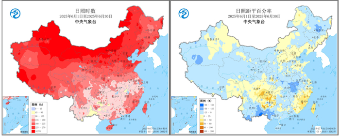 6月,全国平均气温21.4℃,较常年同期偏高1.1℃;其中西北地区东部及新疆、东北地区东部、华北大部、黄淮大部、江淮东部、江南东部、四川盆地大部偏高1~4℃;河北中南部、山东大部、河南北部、陕西南部、四川盆地、江苏东南部、浙江东部、福建东部以及新疆大部日最高气温≥35℃日数偏多4~12天(图1)。全国农区普遍出现25~250毫米降水,其中长江中下游、华南中西部和贵州南部等地降水量有250~600毫米;东北地区北部、内蒙古东南部、黄淮南部和东部、长江中下游大部、华南中部及贵州东南部、云南大部等地降水偏多3成至2倍,江南东部、华南东部及新疆等地偏少3~9成(图2)。全国平均日照时数为211小时,较常年同期偏少8.4小时;湖北东部、广西西部和云南东部偏少3~5成,福建、四川盆地东南部、贵州大部等地偏多3~8成(图3)。