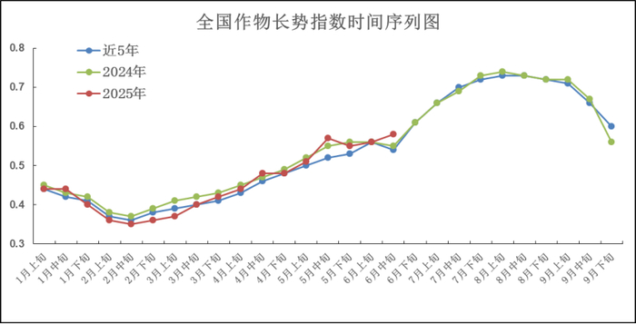 全国农作物长势遥感监测结果表明,至6月中旬,全国大部作物长势接近或好于上年同期(图5),长势持平和偏好面积比例为89.8%,仅广西南部、广东西南部等地作物长势差于上年同期。6月中旬,全国作物遥感长势指数平均为0.58,比上年同期高0.03,比近5年平均值高0.04(图6)。