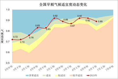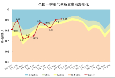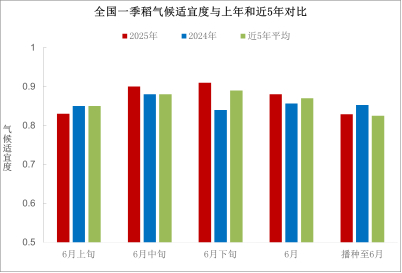 播种以来,全国一季稻平均气候适宜度为0.83,适宜度等级为适宜,接近近5年平均、比上年同期低0.02。其中,6月全国一季稻平均气候适宜度为0.88,比上年同期高0.02,比近五年平均高0.01,适宜度等级为适宜(图8)。