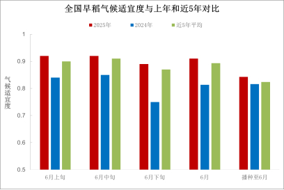播种以来,全国早稻平均气候适宜度为0.84,适宜度等级为适宜,比上年同期和近5年平均高0.02。其中,6月全国早稻平均气候适宜度为0.91,比上年同期高0.1,较近五年高0.02,适宜度等级为适宜(图7)。