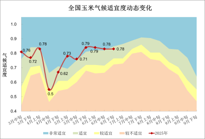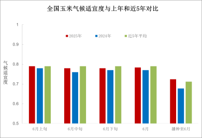播种以来,全国玉米平均气候适宜度为0.72,适宜度等级为非常适宜,比上年同期高0.04,比近5年平均高0.01。其中,6月全国玉米平均气候适宜度为0.78,比上年同期高0.01、比近5年平均低0.01,适宜度等级为非常适宜(图9)。