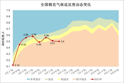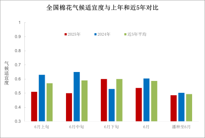 播种以来,全国棉花平均气候适宜度为0.49,适宜度等级为较不适宜,与近5年平均基本持平,比上年同期低0.01。其中,6月全国棉花平均气候适宜度为0.54,比上年和近五年同期分别低0.06和0.05,适宜度等级为较适宜(图11)。