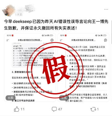 于是,昨天还是“DeepSeek给王一博道歉”的话题,今天变成了“DeepSeek给王一博道歉是假的”。以上就是这起无厘头事件的大致发展脉络。