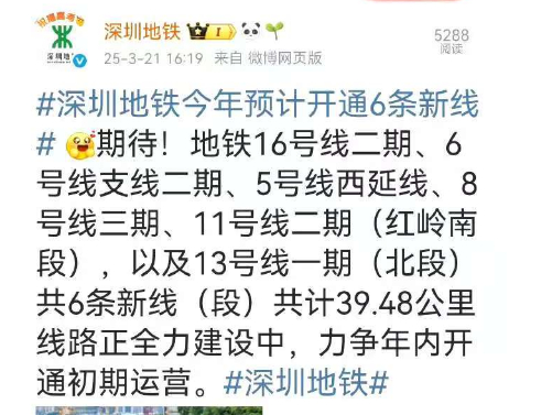 据@深圳地铁公众号官宣,今年预计开通6条地铁新线,除地铁13号线外,还有5号线西延、6号线支线二期、16号线二期、11号线二期(红岭段)、8号线三期工程。