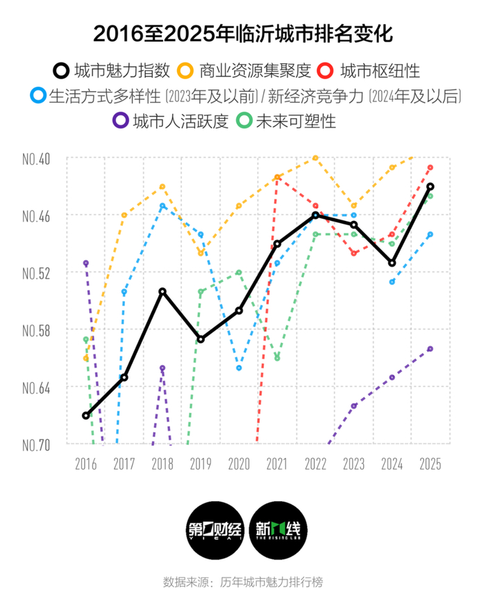 根据第一财经旗下城市数据研究智库新一线城市研究所数据分析,从临沂2016年-2025年间五大指标变化曲线看出,随着城市枢纽性猛烈拉升,临沂的商业资源聚集度在近10年间成为表现最突出的上升曲线。