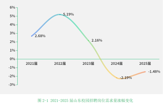 齐鲁人才网《山东2025届校招报告》显示,从近五年山东校园招聘岗位需求量变化看,校招需求经历了一个“上升-回落-调整”的完整周期,2025年降幅比缩小了0.71个百分点,释放出企稳信号。齐鲁人才网有关人员表示,虽然近两年岗位总量持续收缩,但结构性优化趋势明显。岗位缩减主要集中在传统行业或受经济周期影响较大的领域,而人工智能、新能源、智能制造等新兴行业都在积极吸纳人才,且对高质量毕业生需求持续增长。