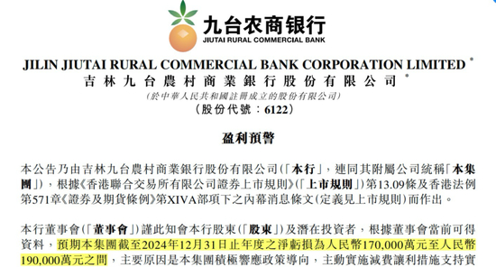 公告同日,九台农商银行发布了盈利预警,该行表示,根据董事会当前可得资料,由于减费让利以及外部经济环境的影响,预期该行截至2024年12月31日止年度之净亏损为人民币17亿元至人民币19亿元之间。