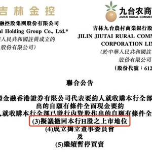 7月3日,吉林九台农村商业银行(简称“九台农商银行”)公告称,中金公司将代表吉林省金融控股集团股份有限公司(下称“吉林金控”)就收购所有已发行H股作出自愿有条件全面现金要约,H股要约价为每股H股0.7港元。