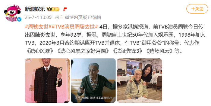 TVB“御用爷爷”周骢因肺炎去世
