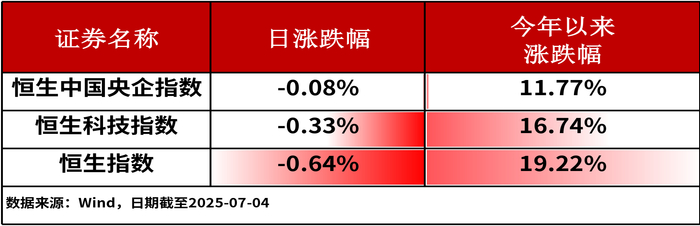 7月04日,港股主流指数集体收跌。其中,恒生中国央企指数下跌0.08%,跌幅相对最小。