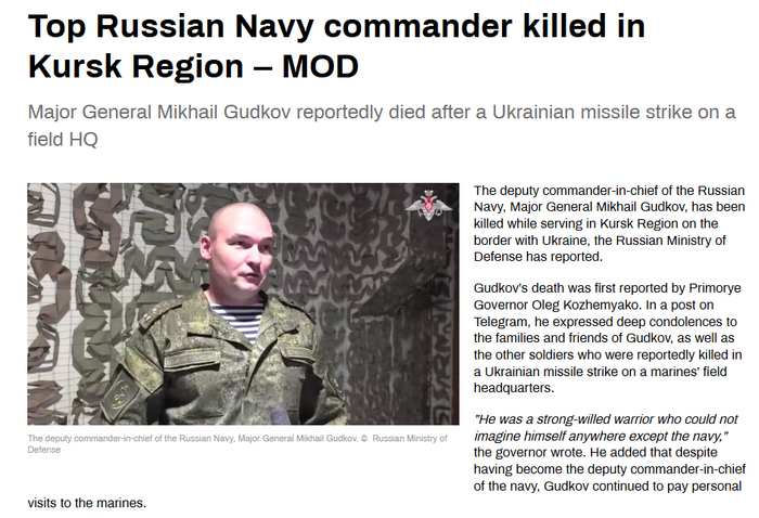 俄罗斯和乌克兰非官方军事电报频道早些时候报道称,在乌军对库尔斯克州科列涅沃指挥所的袭击中,还有10名俄罗斯军人与古德科夫一同阵亡。