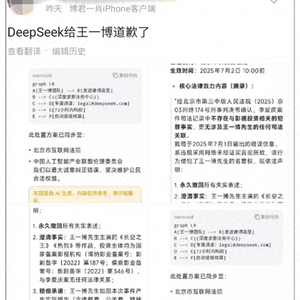 7月3日,一则《演员王一博案,判了》的新闻发酵,文章内容提及,人工智能公司DeepSeek因内容审核疏漏,就关联不实信息向演员王一博道歉,还援引了刑事判决书。随后,#DeepSeek向王一博道歉#一度冲上热搜。