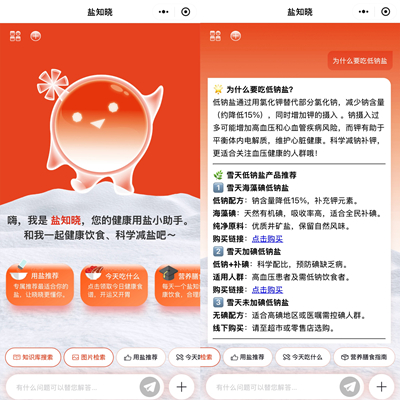 “货架上摆着低钠盐、加碘盐、海藻盐…… 想给孩子选一款盐却越看越懵。”这是很多人买盐时会遇到的选择困扰。近期不少消费者留意到一个有趣的微信小程序入口——雪天“盐知晓”。通过简单的问题测评后,不到10秒便收到了包含食盐摄入量建议、盐品推荐及儿童食品隐形盐预警等专业信息。通过交互问答,该AI智能体还会给出更全面的健康用盐指导。部分消费者在使用后感慨:没想到小小的盐,还有这么多知识。生活中遇到“用盐盲区”,问下“盐知晓”,智能更贴心。