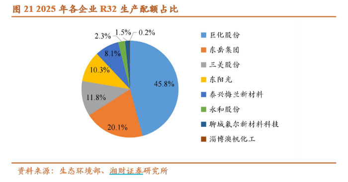 R32的生产配额中,巨化股份12.8万吨,占比45.8%,东岳集团5.6万吨,占比20.1%,三美股份3.3万吨,占比11.8%,CR3约为77.7%。