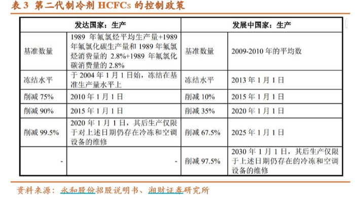 目前第二代制冷剂HCFCs,在发达国家已经基本削减完毕。针对发展中国家,其产量已经于2013年被冻结。国内实行配额制度,满足阶段性的履约需求,包括冷冻和空调设备的维修。二代制冷剂红利将持续至 2030 年 R22 全面停产,成为头部企业的稳定利润来源。
