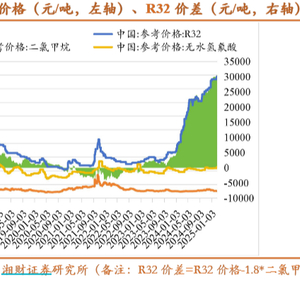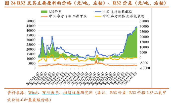 ● 价格中枢大幅上移: 供需关系的逆转,直接推动了主流第三代制冷剂产品如R-32、R-134a、R-125等价格的持续上涨。从2023年下半年政策预期明朗开始,到2024年配额正式落地,相关产品价格涨幅显著,部分产品价格甚至翻倍,为生产企业带来了丰厚的利润。而制冷剂占空调成本不足 1%,下游对价格敏感度极低。以 R32 为例,价格每涨 1 万元 / 吨,1.5 匹空调成本仅增 8 元(占售价 0.4%),企业可轻松转嫁成本。