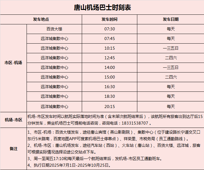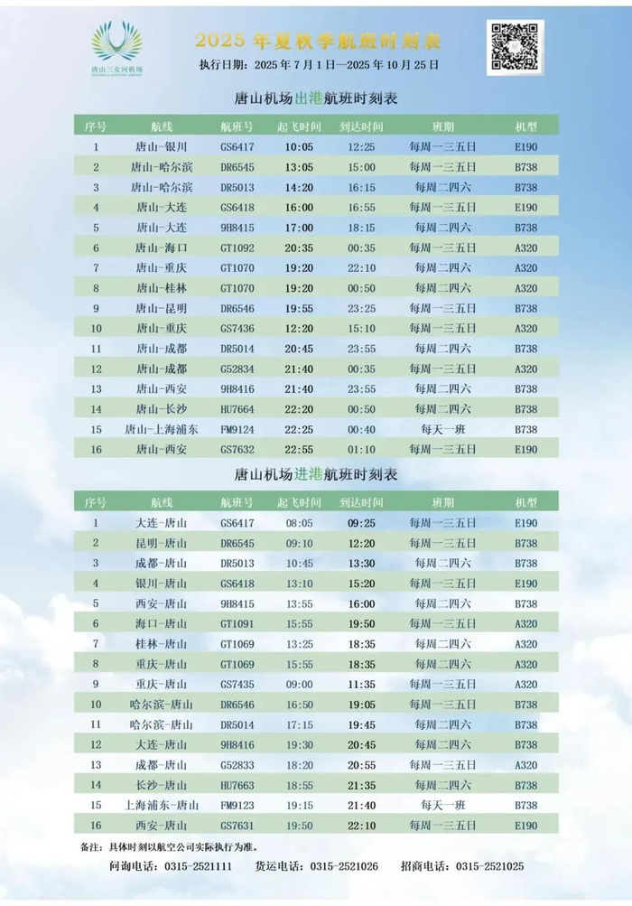 为优化航线资源配置,提升航空服务品质,唐山机场于2025年7月1日起进行航班时刻调整。