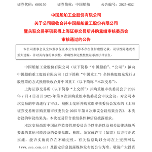7月4日晚,中国船舶披露《关于公司吸收合并中国船舶重工股份有限公司暨关联交易事项获得上海证券交易所并购重组审核委员会审核通过的公告》。