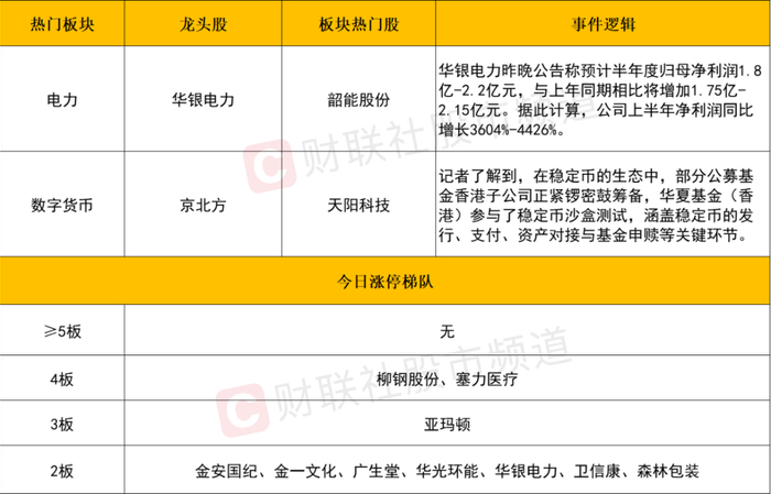 电力:华银电力昨晚公告称预计上半年净利润同比增长3604%-4426%,带动整个电力板块上冲。