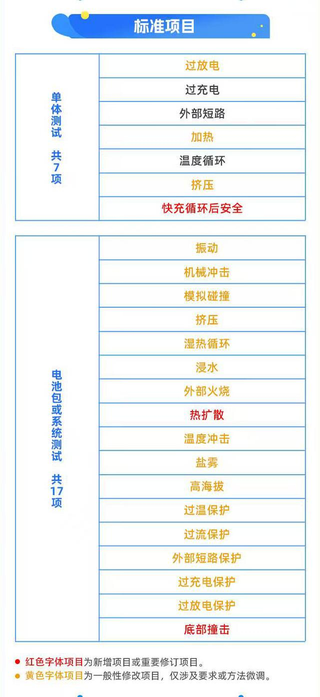 根据工信部《电动汽车用动力蓄电池安全要求》(GB38031-2025),动力电池标准项目单体测试共有7项,电池包或系统测试共有17项;其中新增或重要修订项目有3项,一般性修改项目为18项,仅涉及要求或方法微调。