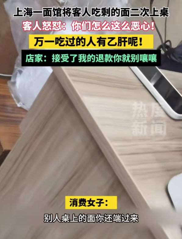 近日,一名女子在网上爆料,自己在上海一家面馆吃面,竟发现面是别人吃剩的,店家只是换了浇头重新端上来。